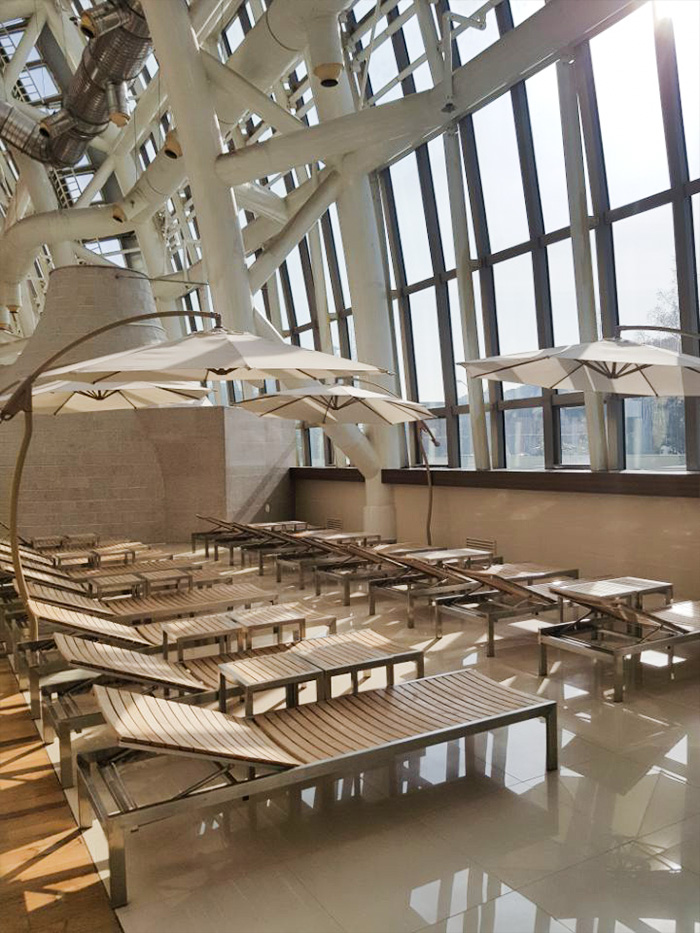 호텔 수영장처럼 누워서 해를 즐길 수 있는 썬배드마저도 럭셔리 그 자체였다. 지하 6층에 위치한 우리 동네 찜질방과 확실히 다르긴 하군. 찜질방에서 가장 마음에 들었던 공간은 프라이빗한 시간을 보낼 수 있도록 칸막이를 설치한 노천 족욕탕. 차가운 야외 공기와 상반되게 무릎 아래부터 뜨거운 열기가 스멀스멀 올라오자 긴장이 풀리고 노곤함이 밀려왔다. 아 그래, 이 맛이야. 몸 전체를 담글 수 있는 노천탕이라면 더 좋았겠지만.