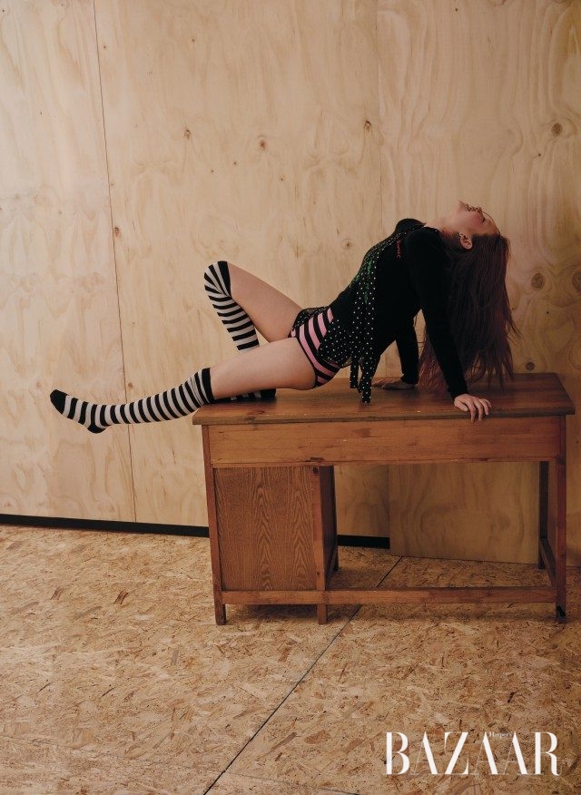 빨강 머리 모델 호연, 1960년대 감성과 아티스트 니키 드 생팔의 일러스트가 어우러진 2018 S/S 시즌의 뉴 룩을 입고 카메라 앞에 서다.