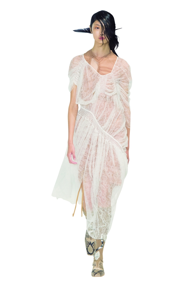 에로티시즘에 대한 환상을 표현한 크리스토퍼 케인의 런웨이에는 은밀하면서도 어두운 페티시 스타일이 가득했다. 그중에서도 BP만 간산히 가린 블랙 시스루 레이스 블라우스는 제인 버킨을 오버랩시켰다.