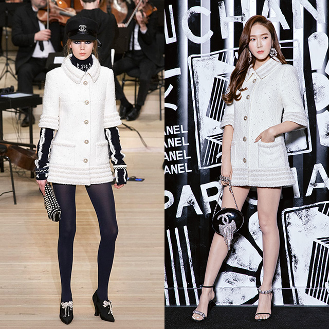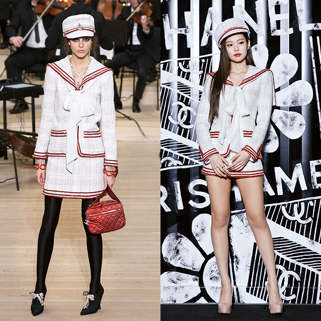 인간샤넬 이라는 별명을 보유한 블랙 핑크 제니. 칼 라거펠트의 터치로 샤넬 고유의 모더니즘이 더해진 마린 룩의 결정체를 보여줬다. 선원복에서 영감 받은 세일러 재킷과 미니 스커트, 화이트와 레드의 조화, 세일러 캡까지! 진주 네크리스, 이어링, 커프스 등 화려한 액세서리까지 더한 모델보다 룩 하나로 존재감을 더한 제니에게 한 표를 더한다.