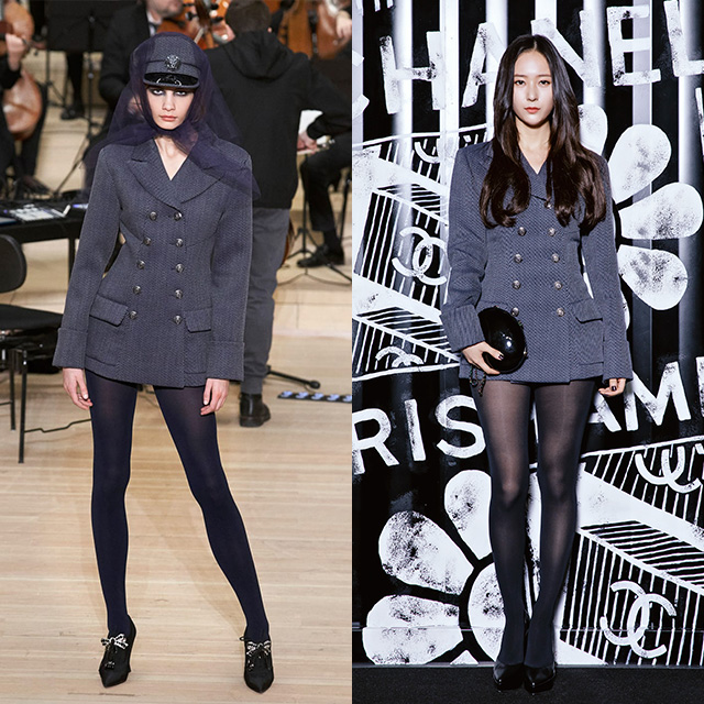 네이비 블루와 그레이의 조화로 완성된 더블 브레스트 재킷 하나로 존재감을 드러낸 크리스탈. 다른 액세서리 없이 모던한 마린 룩의 정수를 보여줬다. 네이비 컬러의 타이즈로 룩에 통일성을 주고 구조적인 미니 백으로 시크하게 마무리 했다.