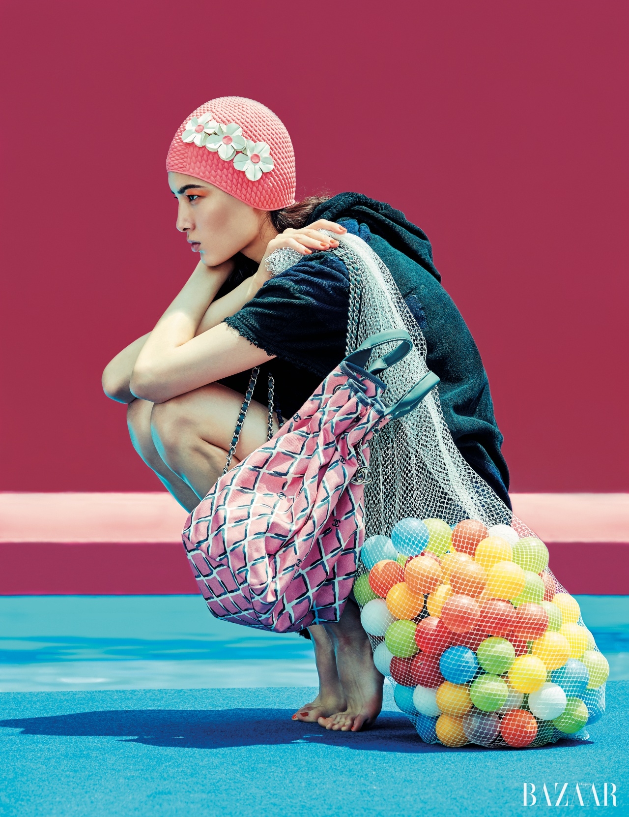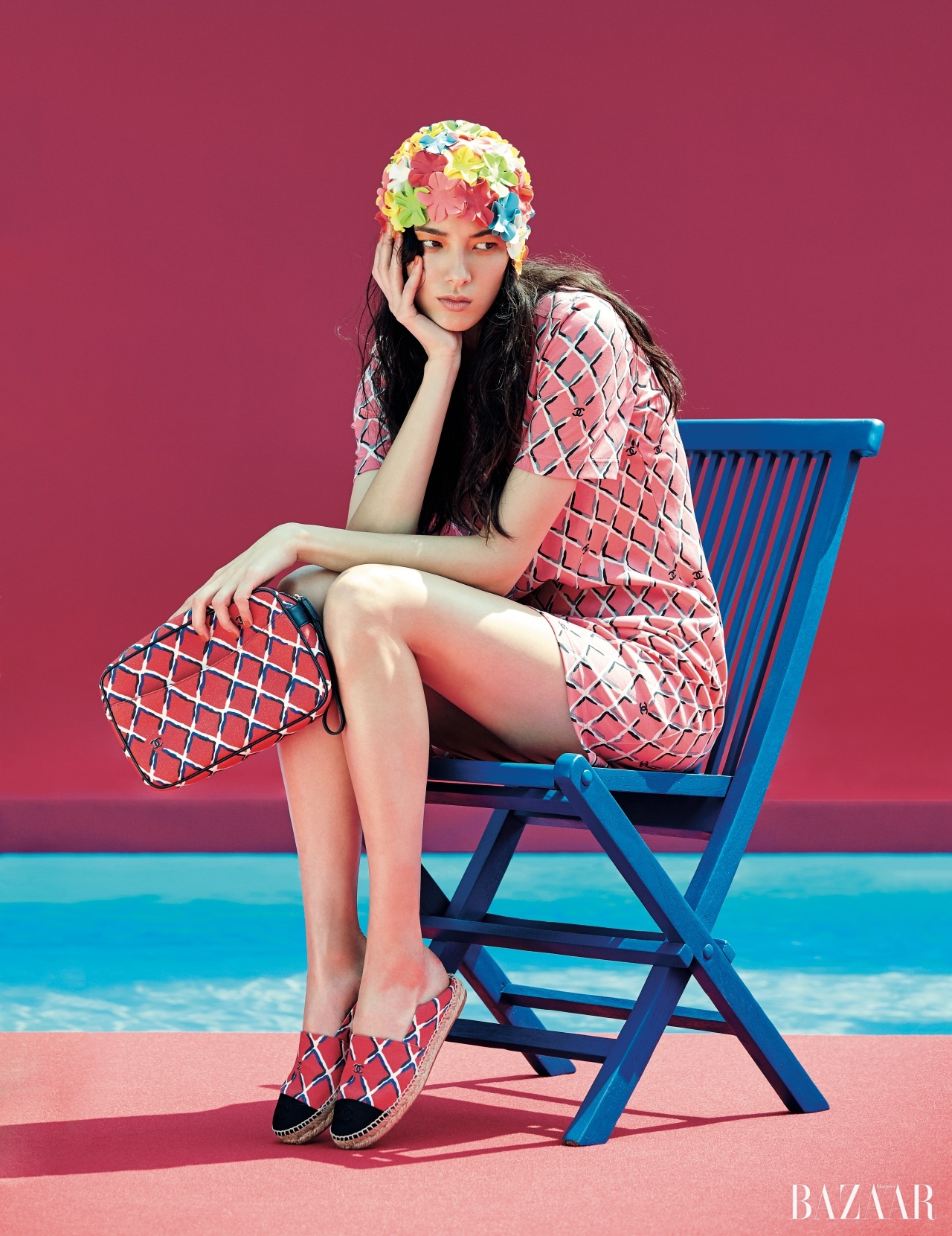 나염 패턴의 수영복, 캔버스 소재의 에스파드리유는 모두 Chanel 제품.