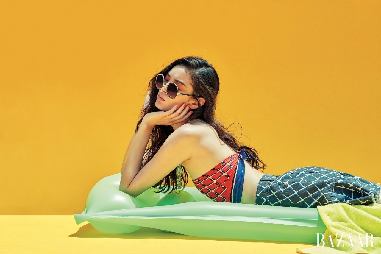 톱으로 연출한 팝한 패턴의 스카프, 데님 스커트, 라운드 프레임의 선글라스, 투명한 소재의 목걸이는 모두 Chanel 제품.