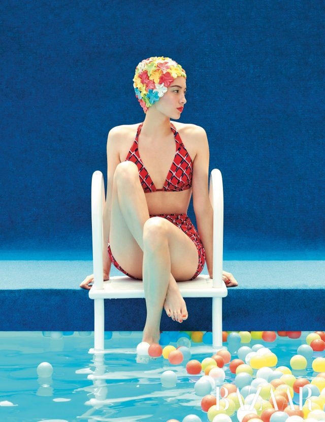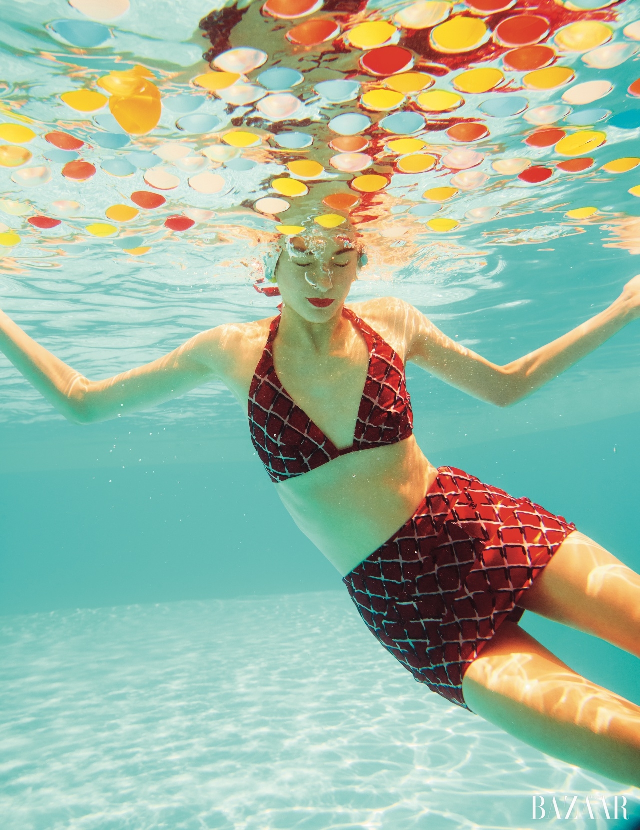 홀터넥 비키니 톱, 스커트 형태의 스윔쇼츠는 모두 Chanel 제품.