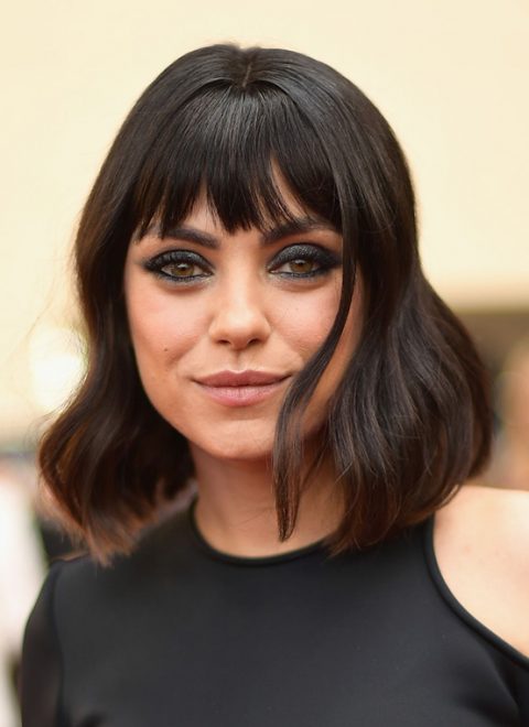 앞머리와 끝 부분에 약간의 드라이를 넣은 밀라 쿠니스. 흑발과 앞머리 숱 없는 풍성한 헤어스타일 때문에 답답해 보이기도. 혹시...가발?