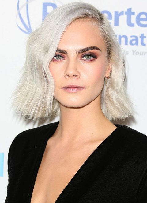 세상 시크한 플래티넘 컬러의 단발의 카라 델레바인. 스트레이트용 고데기로 한 번 꼬아주면 누구나 쉽게 그녀같은 그래픽적인 컬을 완성할 수 있다.