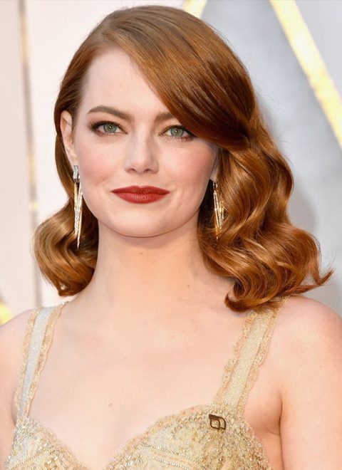 1:9 가르마로 만들어진 빛나는 ‘인형 펌’의 주인공은 엠마 스톤. 골드-브라운의 헤어 컬러, 벽돌색 립스틱, 골드 빛의 이어링과 드레스가 그녀를 완벽한 ‘여신’으로 만든다.