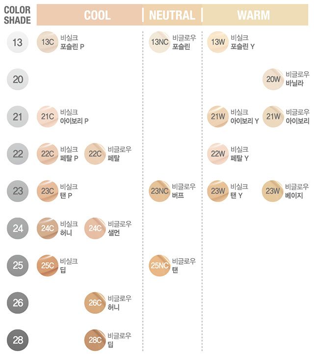 앞서 말한 바와 같이 한국 여성을 위한 베이스 컬러는 생각보다 다양하고 체계화되어야 한다. 하지만 무조건 컬러가 많은 게 답은 아니다. 모 글로벌 브랜드의 옐로 베이스는 얇은 피부를 가진 서양인의 붉은기는 커버할 수 있지만 옐로 언더 톤의 한국인 피부에는 오히려 칙칙하게 표현될 뿐이었으니까. 같은 옐로 베이스라도 컬러를 구성하는 원료에 따라 느낌이 달라지는데 에스쁘아는 이러한 부분에 착안하여 수많은 조색 테스트를 했고 그 결과 한국인 피부를 가장 맑게 표현할 수 있는 컬러 체계를 찾아냈다. 한국 여성의 피부에 가장 자연스럽게 매치할 수 있는 아이보리 유백색 안료를 조색하여 옐로 언더 톤에 최적화된 옐로 베이스를 만든 것. 대표적인 제품이 바로 에스쁘아 ‘프로 테일러 파운데이션’이다. 특히 ‘프로 테일러 파운데이션 비 글로우’는 전 세계 패션쇼 백스테이지에서 다양한 모델들과 작업한 프로 메이크업 아티스트와의 협업을 통해 보다 완성도 높은 컬러 셰이드를 완성했다. 그 결과, 23호 이상의 피부톤도 인생 베이스를 찾을 수 있게 됐는데 ‘샐먼 컬러’는 노란기가 강해서 피부 표현이 어려웠던 어두운 피부를 자연스럽게 톤업해준다. ‘프로 테일러 파운데이션 비 실크’는 화사함을 더하는 핑크 베이스와 혈색을 부여하는 옐로 베이스로 나눠 차별화된 컬러 포트폴리오를 구축했다. 또 다크닝 현상이 없어 시간이 지나도 처음 발랐을 때 피부 컬러를 그대로 유지해준다. 이처럼 에스쁘아 ‘프로 테일러 파운데이션’은 한국 여성들의 다양한 피부톤을 모두 커버할 수 있는 차별화된 컬러 포트폴리오를 갖추고 있다. 참고로 에스쁘아의 컬러 홋수는 누구나 보기 쉽도록 숫자와 알파벳으로 구성돼 있는데 숫자는 밝기, 알파벳은 톤(W는 웜 톤, C는 쿨 톤, N은 뉴트럴)을 의미한다.