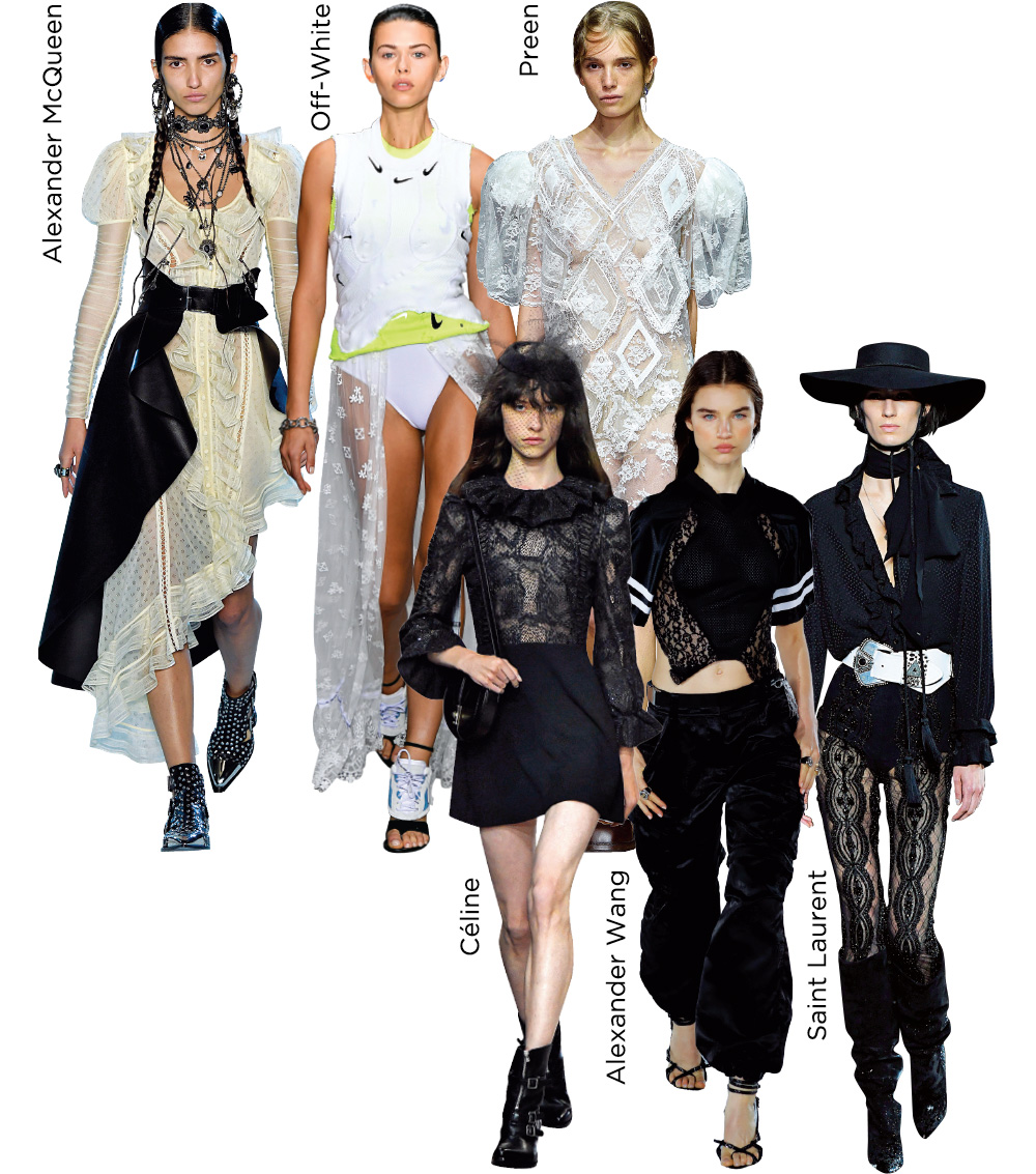 레이스는 더 이상 로맨틱의 상징이 아니다 . 2019 S/S 시즌 트렌드의 중심으로 진입한 레이스는 보다 파워풀하고 중성적이다. 레이스를 패치워크한 빅토리아 베컴의 오버사이즈 셔츠에 남성성과 여성성이 공존하는 것처럼! 사카이나 오프 화이트 컬렉션에서 스포티한 아이템에 레이스 가운을 매치한 방식도 주목해보자.