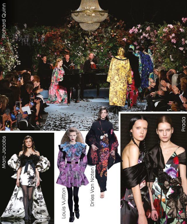 이슬이 내려앉은 밤의 정원, 달빛 아래 반짝이는 각양각색의 꽃들. 새로운 시즌의 로맨티시즘은 모던한 레이디라이크 무드와 톤다운된 플로럴 프린트의 만남으로 탄생했다. 디자이너들은 꽃을 표현함에 있어 보다 극적인 효과를 끌어내기 위해 3D 디지털 프린팅(알렉산더 맥퀸), 콜라주(발렌티노), 입체적인 코르사주 장식(프라다)에 이르기까지, 다양한 방법을 총동원했다. 특히 로이 오비슨의 ‘Crying’을 BGM으로, “우아함에 대한 모순된 열망”을 표현하고자 했던 드리스 반 노튼은 프린트의 장인답게 그만의 멜랑콜리한 로맨티시즘을 표현했다. 무엇보다 이 키워드를 가장 명징하게 느낄 수 있었던 순간은 ‘비밀의 정원’을 콘셉트로 한 리처드 퀸의 피날레 신.