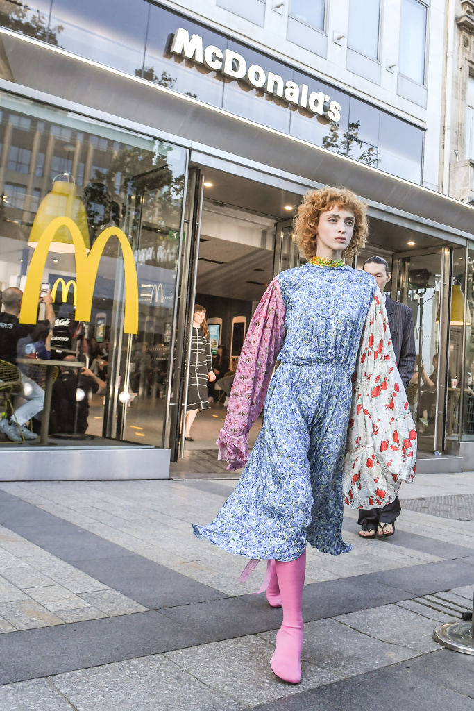파리 샹젤리제 거리의 맥도날드 매장에서 패션쇼를 관람하게 될 줄 누가 상상이나 했을까. 게이바, 중국 레스토랑, 교회, 백화점, 퐁피두 센터, 골동품 시장, 박물관까지, 매 시즌 의외의 장소를 무대로 한 베트멍이 이번엔 파리 샹젤리제 거리의 맥도날드로 초대했다. 컬렉션 테마가 적힌 냅킨, 브랜드 이름을 손글씨로 적어 놓은 음료수 등을 연출해 실제 매장의 모습까지 그대로 재현했다. 매장 점원과 보안요원 유니폼을 입은 모델을 시작으로 백 대신 감자튀김 패키지를 손에 쥐고 등장한 모델까지. 패스트 푸드 매장에서의 예측불허 무대가 꾸며졌다. “어린 시절, 항상 맥도날드에서 생일파티를 열고 싶었어요.” 뎀나 바잘리아는 어릴 적, 부유한 아이들의 생일파티장으로 통했던 기억을 회상하며 당시 자본주의를 풍자하기 위해 패스트 푸드 매장에서 쇼를 열었다고.