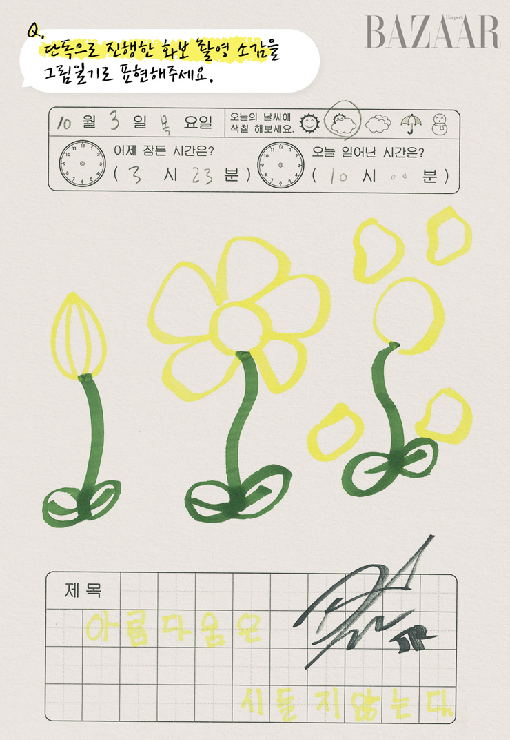 단독으로 진행한 화보 촬영 소감을 그림일기로 표현해주세요.