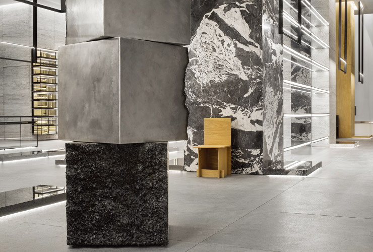 ‘뉴 셀린’ 시대의 시작을 알린 뉴욕 매디슨가의 플래그십 스토어. 역대 셀린 매장 중 가장 큰 사이즈인 5천 평방피트(약 140평) 규모에 흑과 백, 메탈과 참나무의 강렬한 대비가 돋보이는 인테리어는 에디 슬리먼의 취향을 고스란히 보여준다. 내부에 있는 거대한 정육면체 탑과 거울, 화산암을 소재로 한 설치물은 각각 아티스트 제임스 뱀포스(Jame Balmforth)와 호세 다빌라(Jose D`avila)의 작품. 거대 콘크리트와 철제 폐기물 등을 활용하는 1950년대 건축양식, 브루탈리즘의 정제된 버전을 공간 속에 담고 싶었던 슬리먼이 협업을 제안했다. 참고로 매장에 놓인 황갈색 벤치는 슬리먼이 직접 디자인한 가구다.