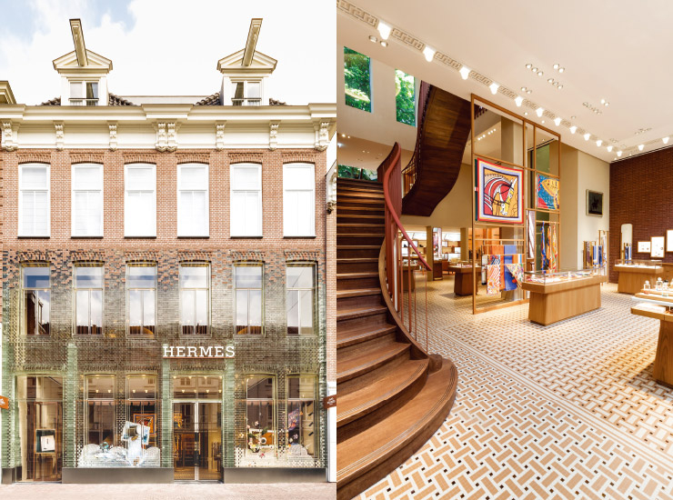 건물 외벽이 반짝이는 유리 벽돌로 제작돼 ‘크리스털 하우스’로 불리는 이곳. 암스테르담의 쇼핑 거리인 피터르 코르넬리스 후프트스트라트에 있는 에르메스 부티크는 2016년 네덜란드 디자인 사무소 MVRDV가 제작한 유리 파사드 건물에 브랜드의 매장 인테리어를 총괄하는 파리 건축사무소 RDAI가 디자인을 더해 지난 5월, 새롭게 모습을 드러냈다. 이곳의 특별한 점은? 바로 에르메스의 상징적 아이콘인 엑스-리브리스(Ex-Libris) 모자이크 패턴으로 장식된 바닥, 우드 소재 나선형 계단, 1925년에 제작된 그리스 양식의 조명, 이 모든 것을 유리 벽돌 너머로 볼 수 있다는 것.