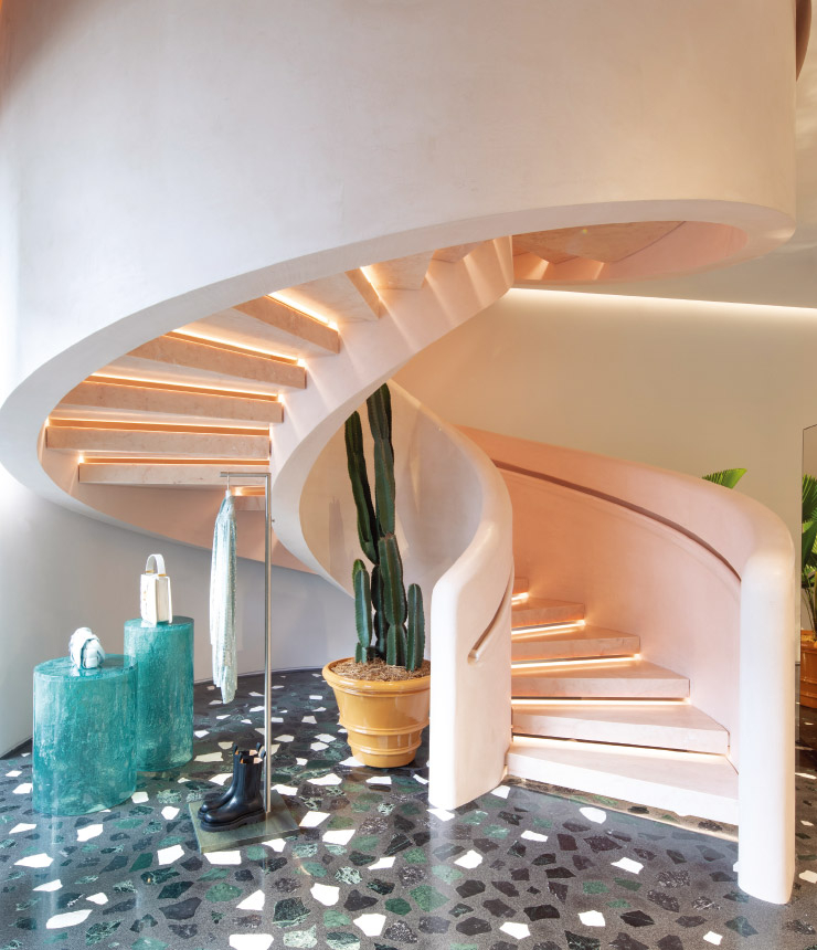 얼마 전 마이애미 디자인 거리에 보테가 베네타의 플래그십 스토어가 들어섰다. 이곳은 2019 패션 어워드 4관왕에 빛나는 크리에이티브 디렉터, 다니엘 리가 기획한 첫 번째 부티크. 벨트 버클을 모티프로 한 브라스 소재 도어 손잡이를 밀고 들어서면 핑크빛 석고와 대리석이 조화를 이룬 나선형 계단이 시선을 사로잡는다. 이처럼 자연적인 소재와 정교하게 가공된 소재의 대비가 주는 아름다움을 매장 곳곳에서 느낄 수 있다. 가령 1층 매장 바닥을 다채로운 대리석 조각으로 완성했다면, 2층 매장 바닥은 재활용 우드를 사용하는 식. 모던한 공간에 작품처럼 전시된 제품들을 보고 있노라면 절로 쇼핑 욕구가 샘솟는다.