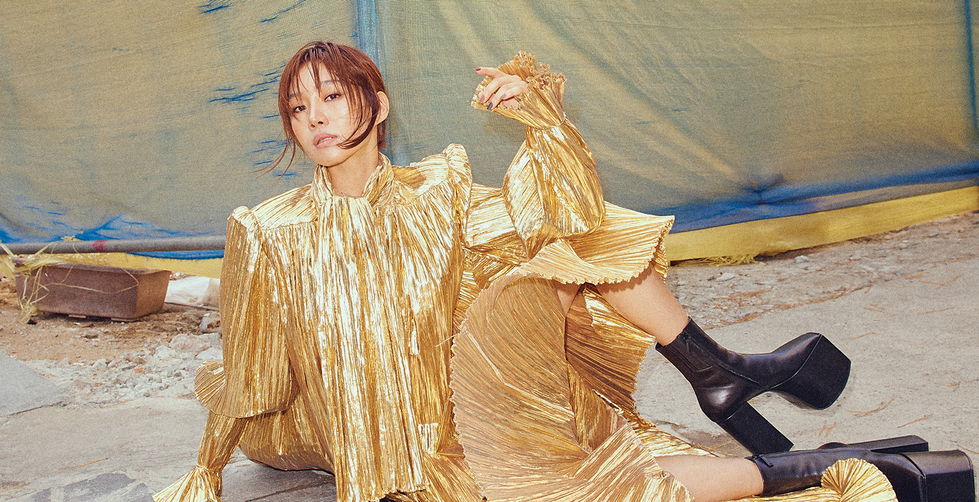퍼피 드레스는 Comme des Garcons. 플랫폼 슈즈는 Miu Miu. 양말은 스타일리스트 소장품.