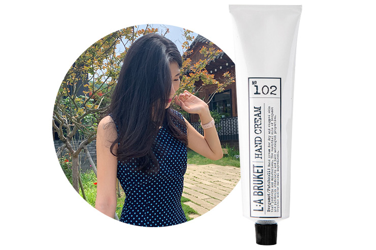 "스웨덴의 자연환경과 디자인을 담은 브랜드 라부르켓의 손 세정제를 많이 사용했었는데, 사용감에 반해 같은 향의 핸드크림을 사용해보게 됐습니다. 크림 제형을 롤링 하듯 사용하면 꾸덕한 느낌이 들지만, 피부에 싹 흡수되며 끈적임을 전혀 남기지 않죠. 건조함은 싹 잡아주고 손 피부는 보송하게 유지해 주는 제품! 손 세정 후 물기를 조금 남긴 채 발라주면 더 부드럽고 촉촉하게 사용할 수 있답니다. 대용량 제품은 욕실에 비치해두고 수시로 사용하기 좋습니다." - 프리랜서 손모델 헤일리