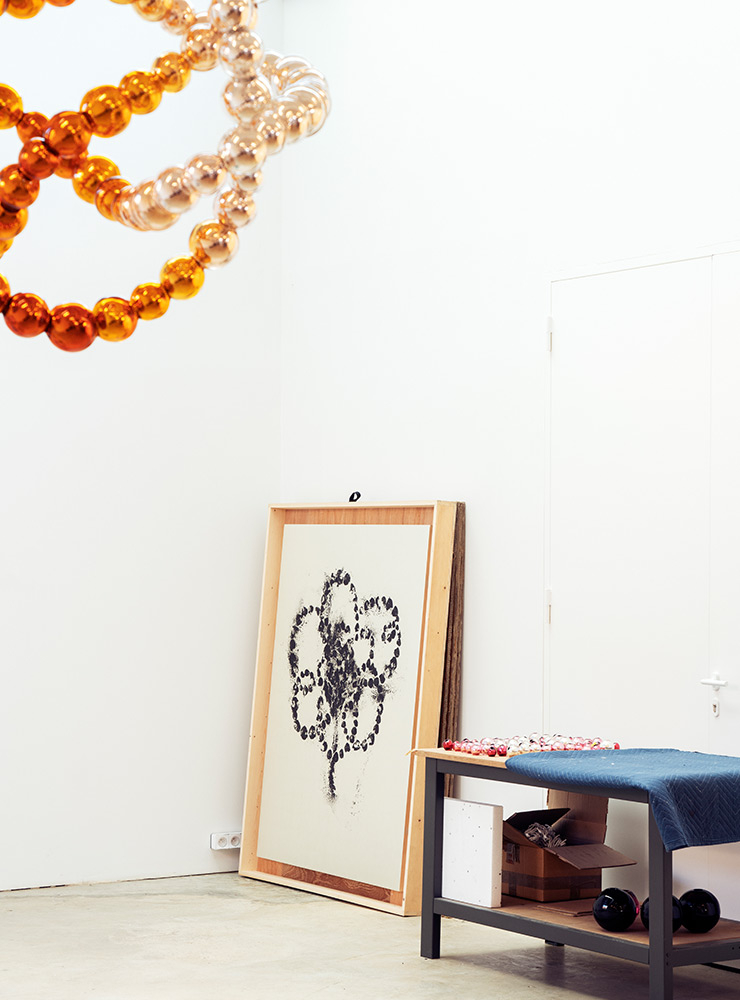 유리 벽돌 작업 <Precious Stonewall>과 <Stairs to Paradise>, 유리 구슬 작품이 어우러진 스튜디오 전경. 작가는 이렇게 말한다. “유리 벽돌 작품은 지금 우리가 받고 있는 압박과 스트레스에 대한 답일 겁니다. 공통의 꿈으로 향하는 제단 혹은 사색의 지지대 같은 작업이에요.”