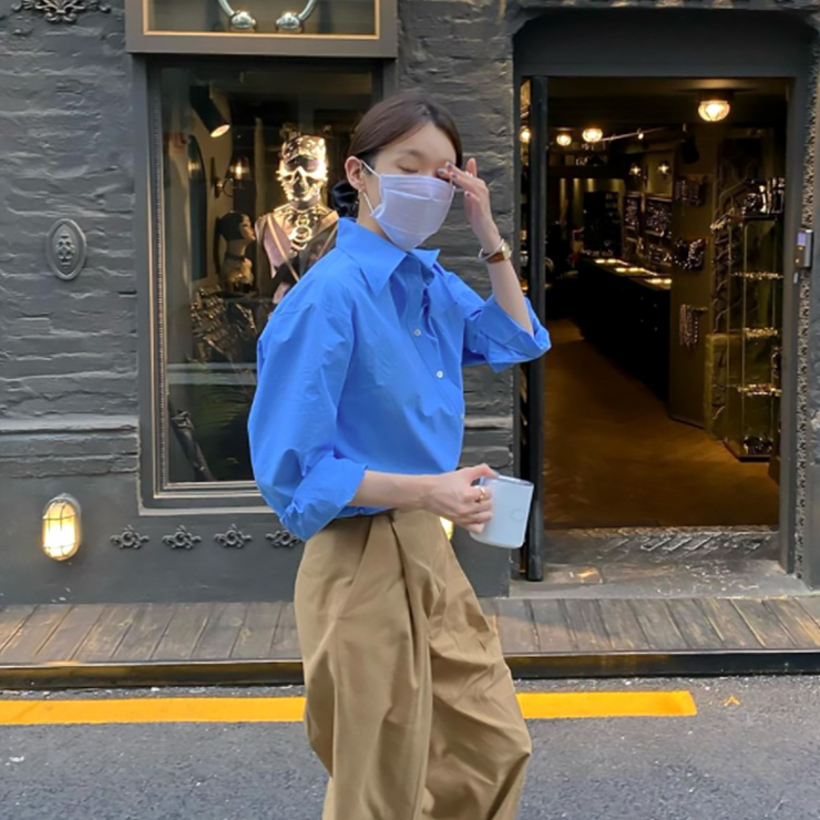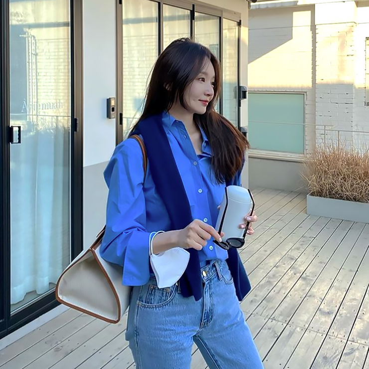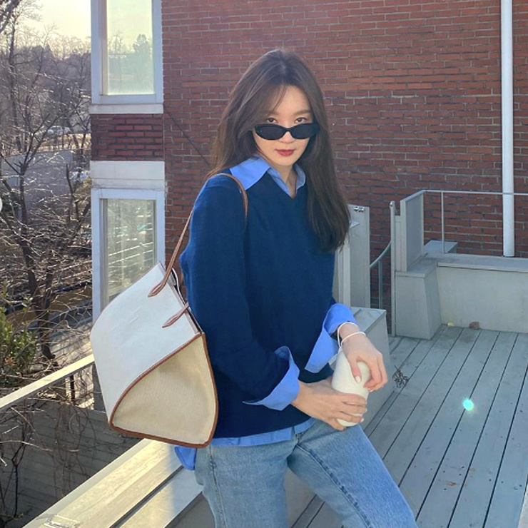 요즘 같은 환절기에 가장 입기 좋은 스타일이다. 셔츠에 니트를 레이어링 해볼 것! 포근함은 물론 니트 위에 은근하게 보이는 셔츠 소매가 다양한 매력을 연출할 수 있다. 특히 어떤 셔츠 컬러를 매치하느냐에 따라서도 다른 무드를 완성할 수 있다. 강민경은 블루 컬러의 톤온톤 매치로 여성스러우면서도 청량한 분위기를 살렸다.