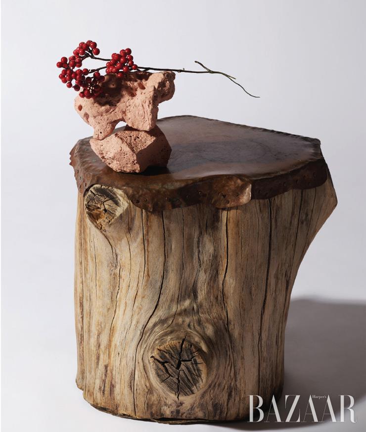 5년 전 남편이 목수에게서 나무 그루터기를 얻어왔다. 그 위에 구리판을 덮어 씌워 침대 옆에 놓는 사이드테이블로 만들어주었다.