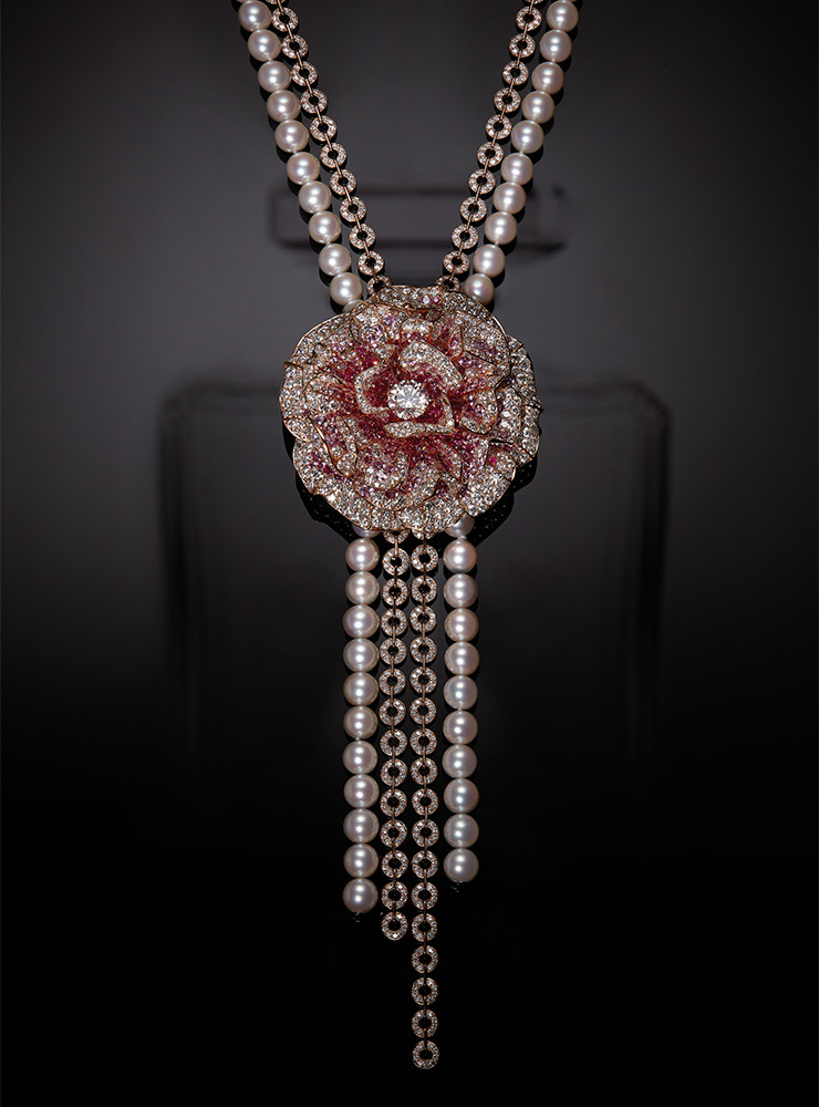‘N°5’ 향의 중심인 재스민, 메이 로즈, 일랑일랑 같은 꽃이 형형색색의 주얼리 세트 위에 만개한다. 볼륨감 있게 작업한 플라워 장식과 1932년 선보인 ‘비쥬 드 디아망’ 컬렉션에 등장했던 별, 달, 태양이 어우러져 웅장한 비주얼을 완성한다. 특히 ‘메이 로즈 네크리스’는 ‘소투아르 펄 네크리스’와 다이아몬드를 세팅한 체인을 줄기 삼아 수많은 핑크 사파이어 꽃잎을 피어낸다. 마치 둥근 달처럼 중앙에 자리 잡은 메이 로즈는 향보다 더 진하게 사람들을 매료시킨다.