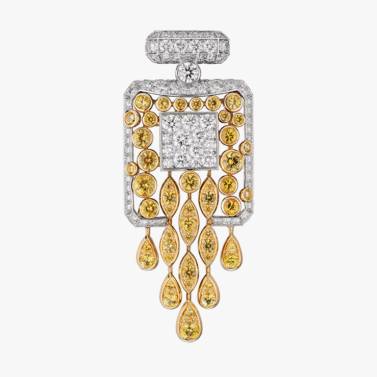 ‘N°5’ 향수 병 모양에 더 큰 상징성을 부여한 건 앤디 워홀이다. 그가 스크린 프린팅으로 찍어낸 ‘N°5’ 향수 병 작품은 뉴욕 현대미술관 모마에 전시될 정도로 21세기를 대변하는 아이콘이었다. 이번 컬렉션에는 유리도, 물감도 아닌 다이아몬드와 옐로 사파이어로 이 전설적인 병을 구현했다. 크기의 율동감과 컬러의 대조로 완성된, 마치 수채화처럼 서정적인 디테일에서 샤넬 하이주얼리만의 세공 기술을 엿볼 수 있다. 영묘한 선을 품은 향수 병은 재킷 위에서, 때로는 피부 위에서 마치 향수처럼 농축된 스타일을 만들어낸다.