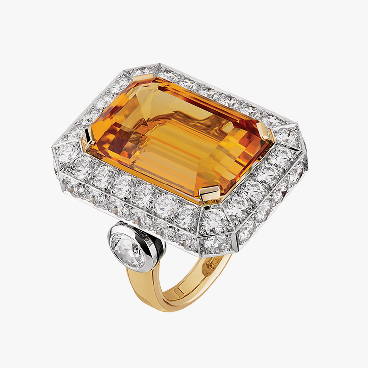 단순하고 순수하며 엄격한 선으로 이뤄진 ‘N°5의 형태는 1920년대의 화려한 향수 병들과 차별화된다. 특히 다이아몬드같이 커팅한 팔각형 스토퍼는 기하학적인 파리 방돔광장을 연상시킨다. 1932년, 다분히 폐쇄적이고 남성 중심적인 방돔광장의 보석상에 패션 디자이너가 발을 들였다는 사실은 하이주얼리 역사에 굉장한 특이점이다. 그 메타포를 담은 ‘N°5’ 스토퍼가 이번엔 진짜 보석으로 탄생했다. 스토퍼를 하이주얼리에 치환시키며 선택한 보석은 22.51캐럿의 임페리얼 토파즈. 수정을 절묘하게 깎아내 다이아몬드, 오닉스, 진주, 옐로 사파이어를 세팅한 8각형 형태의 보석은 추상적이면서도 새롭다. 이외에도 팔각형 스토퍼는 귀고리와 펜던트 같은 새로운 은유로 탄생했다.