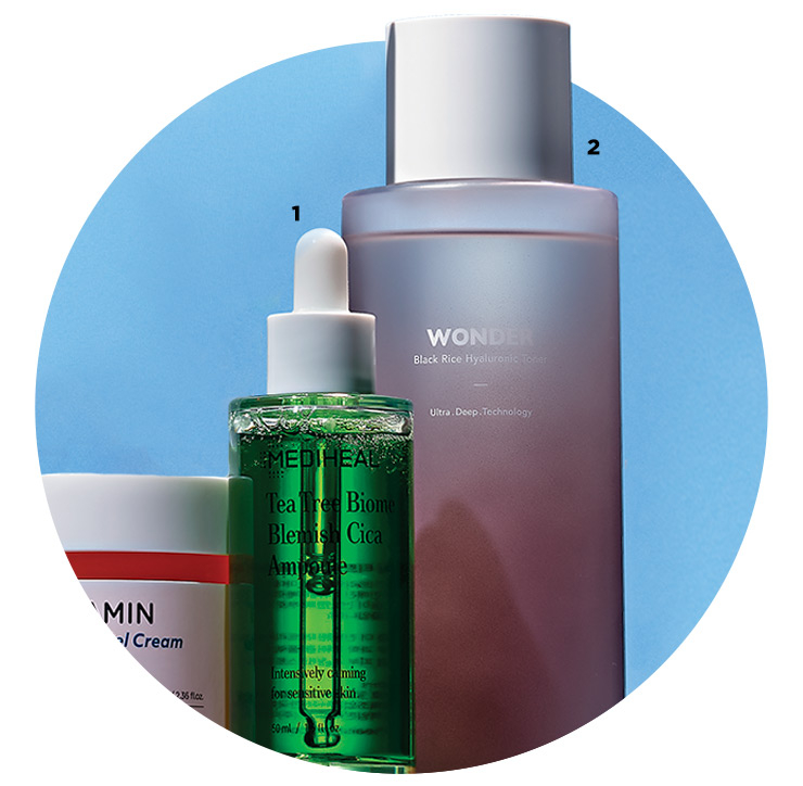 1 Mediheal 티트리바이옴 블레미쉬 시카 앰플 티트리와 병풀, 마데카소사이드 성분이 예민한 피부를 빠르게 진정시켜준다. 고농축 앰풀이지만 토너를 바른 듯 산뜻하게 흡수되는 것이 특징이다. 민감성 피부라면 더욱 추천하는 제품. 2만9천원.