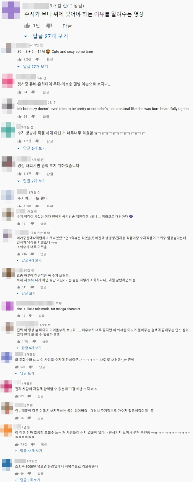 수지(SUZY) ‘수지가 무대 위에 있어야 하는 이유를 알려주는 영상’이라는 댓글에 공감한다. 과거 미스에이 활동 당시 수지의 직캠은 여자 아이돌 음악 방송 직캠 중 베스트에 손꼽힌다. 특히 이 무대는 수지가 방송사 직캠 세대가 아니라 몇 안 되는 직캠 영상 중 하나. 중간에 삭제되어 조회 수는 리셋 됐지만 6년 전 영상이라는 게 믿어지지 않을 만큼 댓글은 전부 최근이다. 그만큼 지금까지도 두고두고 화자 되는 직캠이라는 뜻이기도. 또 수지가 배우뿐만 아니라 가수 활동을 이어가길 바라는 팬들의 마음이기도 하다.(hoxy 숮이 'HUSH' 레전드 직캠 아시는 분 삐삐 좀....)