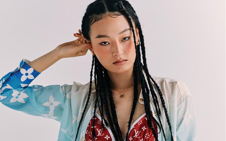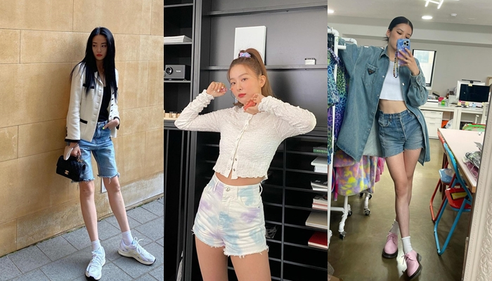 로고 포인트의 크롭트 티셔츠를 착용한 선미. 물감이 스며든 듯한 파스텔 톤 컬러의 패턴과 글리터 로고가 2000년대 초반의 감성을 떠올리게 한다. 화려한 디테일의 티셔츠는 화이트 팬츠와 같은 무채색의 심플한 아이템과 매치한다면 무난하게, 타이다이의 매력을 배가시키는 룩을 연출 할 수 있다.