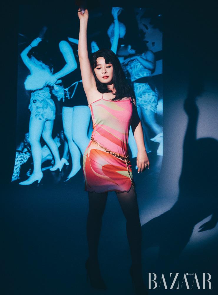 새틴 미니 드레스는 Versace. 골드 체인 목걸이는 Portrait Report. 스틸레토 펌프스는 스타일리스트 소장품.