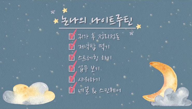 나이트 루틴에도 스트레칭이 빠지지 않는다. 밀라논나는 저녁 식사 후 간단한 스트레칭을 한다. 스트레칭을 할 때는 향초를 켜두는 게 필수! “은은한 향을 맡으면서 스트레칭하면 몸이 좀 더 잘 이완되는 것 같고 마음도 차분해지죠.” 스트레칭을 한 뒤에는 간단한 업무를 보고 독서를 한다. 45년간 매일 적어 온 가계부를 쓰는 시간도 이때다. 샤워, 네일과 스킨 케어를 한 뒤 저녁 기도를 하고 잠자리에 든다.