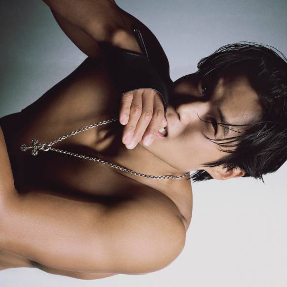 러플 장식 블라우스, 니트 톱, 팬츠는 모두 Celine Homme by Hedi Slimane.