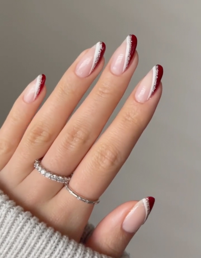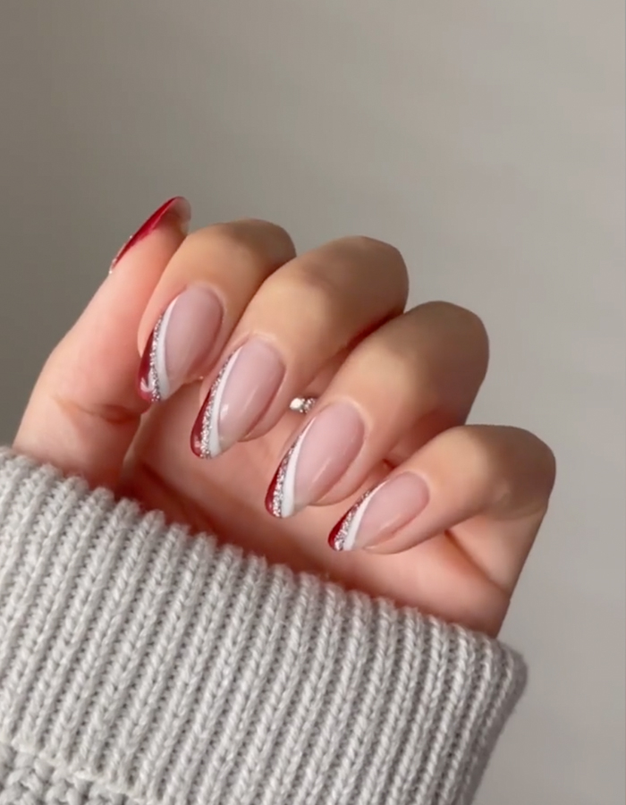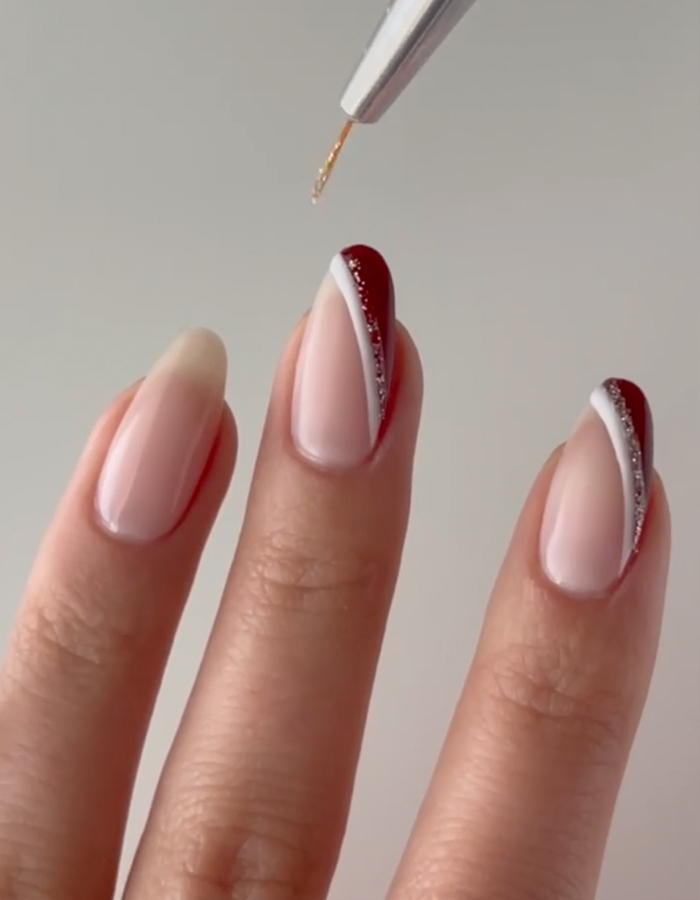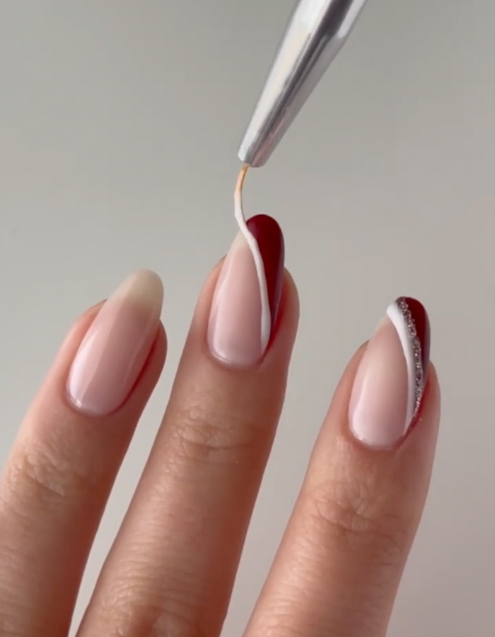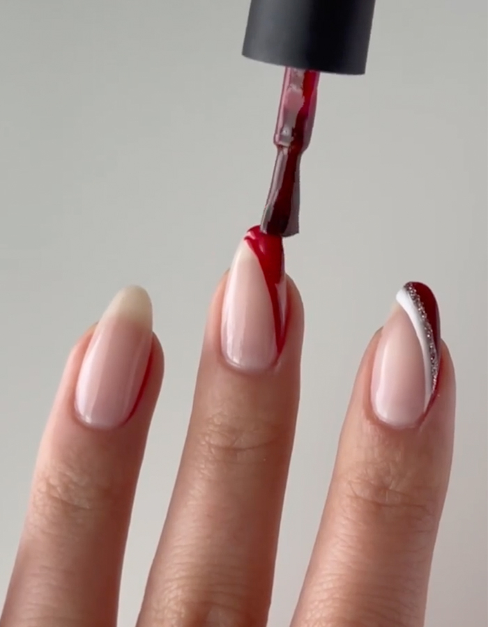 길게 오벌 모양으로 다듬은 손톱에 베이스를 깔끔하게 발라두면 이미 절반은 완성이다. 손톱 끝부분에 사선으로 레드 컬러를 바른 뒤, 화이트 컬러로 경계선을 만들어주고, 레드 컬러와 화이트 경계선 사이 실버 글리터를 활용해 세필로 한 번 더 라인을 그어주면 끝! 홀리데이 무드를 가장 쉽고 빠르게 연출하는 방법이다. 네일 아트 초보자도 손쉽게 따라 하기 제격인 디자인!