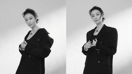 수트, 이너 톱은 Etro. 귀고리는 Roaju. 펜던트 목걸이는 Hoze. 스니커즈는 Vans.