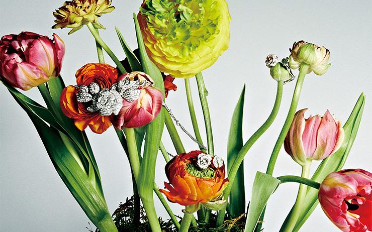 섬세한 다이아몬드 세팅에서 장인정신이 느껴지는 ‘로즈 디올 쿠튀르’ 귀고리, 레이어드한 두 개의 목걸이, 장미 줄기에서 영감받은 ‘브아 드 로즈’ 반지는 모두 Dior Joaillerie. 드레스는 Dior.