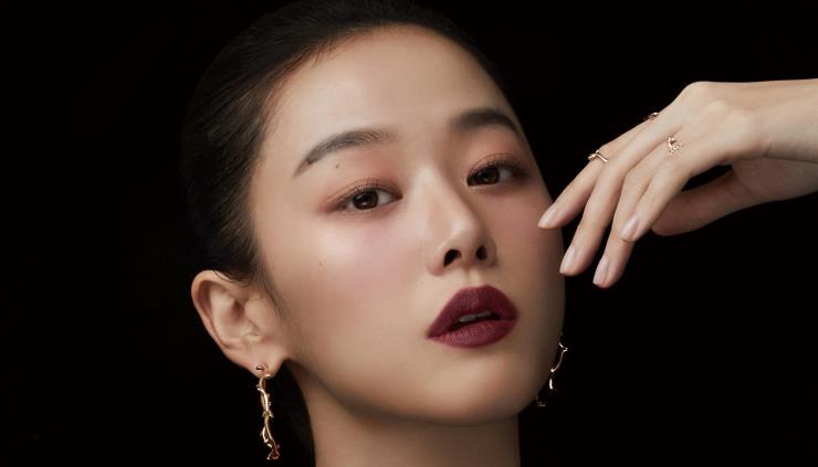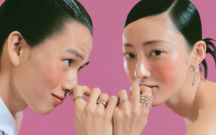 검지에 낀 핑크 골드와 다이아몬드 장식의 ‘브아 드 로즈’ 반지, 약지에 낀 화이트 골드와 다이아몬드의 ‘로즈 디올 쿠튀르’ 반지, 옐로 골드에 다이아몬드가 장식된 ‘브아 드 로즈’ 팔찌는 모두 Dior Joaillerie.