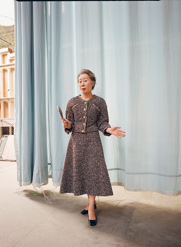 김민하가 입은 원피스는 Bottega Veneta. 윤여정이 입은 재킷, 스커트는 Chanel. 슈즈는 Sportmax.