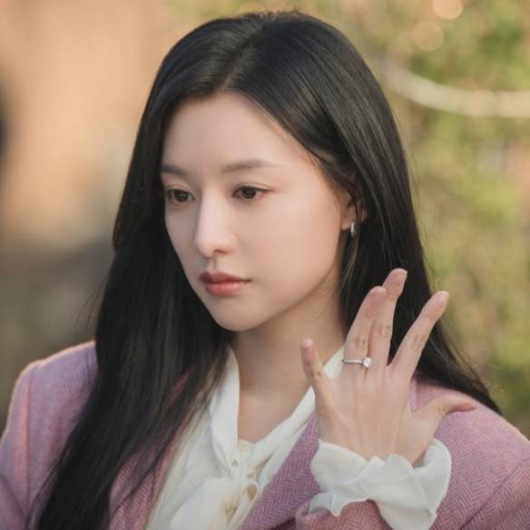다이아몬드가 세팅된 베젤과 버건디 다이얼로 시선을 사로잡는 ‘컨스텔레이션 코-액시얼 크로노미터 스몰 세컨즈 34mm’ 워치, 왼손 검지에 착용한 ‘컨스텔레이션’ 링과 약지에 ‘아쿠아 스윙 와이드 웨이브’ 링은 Omega. 오프숄더 톱은 Totême.