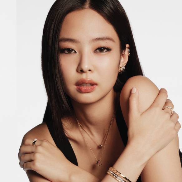 다이아몬드와 화이트 골드 그리고 옐로 골드가 조화로운 이어링, 화이트 골드에 다이아몬드를 장식한 이어링, 오른손 검지와 중지에 착용한 다이아몬드 장식의 화이트 골드와 옐로 골드가 조화로운 링, 약지에 착용한 베이지 골드 라지 링, 왼손 검지에 착용한 화이트 골드 미니 링, 옐로 골드 라지 링, 중지에 레이어드한 2개의 화이트 골드 스몰 링, 약지에 착용한 옐로 골드 스몰 링은 모두 Chanel Coco Crush. 카디건은 Chanel.