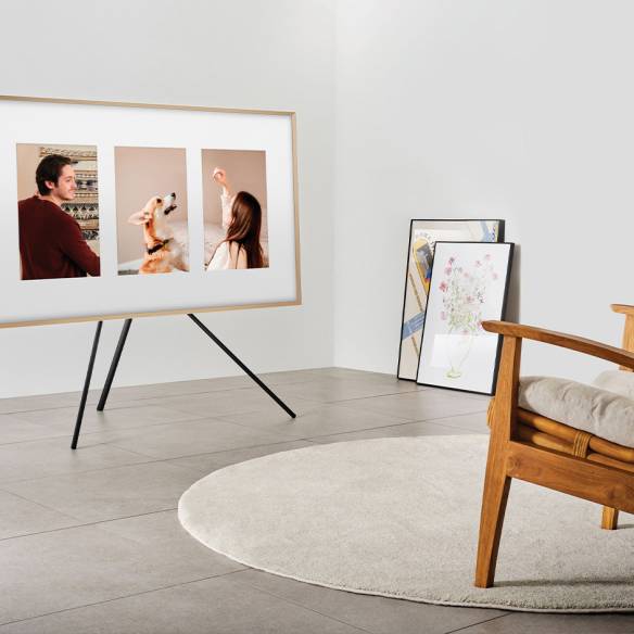 삼성 더 세리프, 비스포크 큐브 에어는 모두 삼성전자. 선반과 스툴은 박진일 작가의 작품. 니트와 스커트는 모두 Ports 1961.