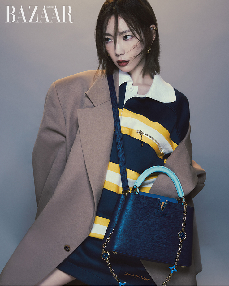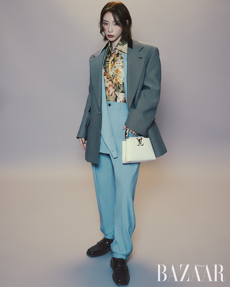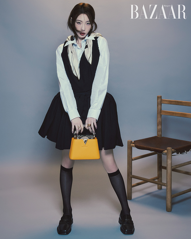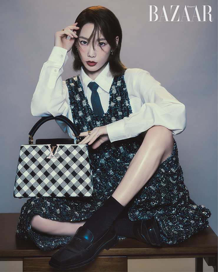 태연이 입은 트위드 드레스, 셔츠, 귀고리, 양손에 착용한 반지, 체크 패턴 ‘카퓌신 BB’ 백, 로퍼는 모두 Louis Vuitton.