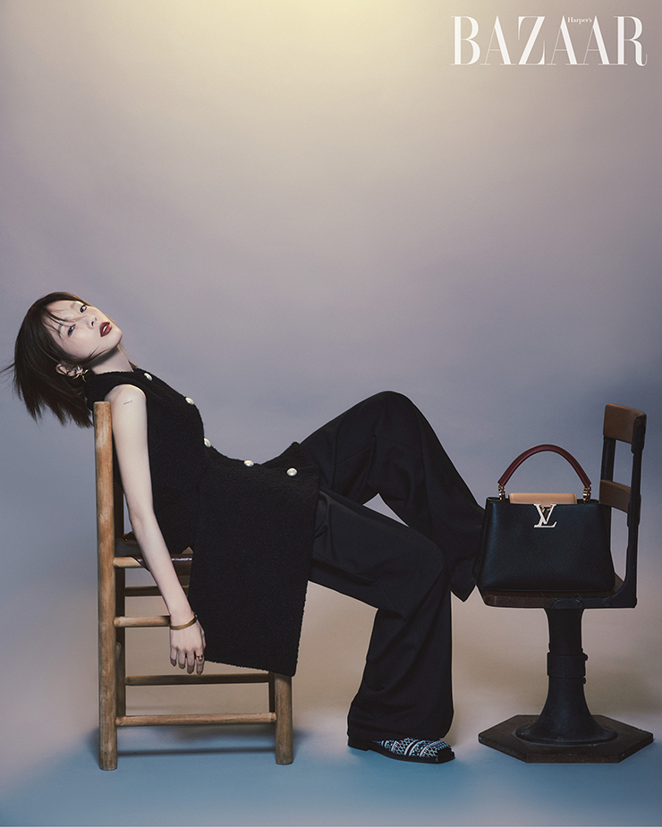 페플럼 톱, 팬츠, 이어커프, 귀고리, 팔찌, 반지, 로퍼, 배색 플랩과 핸들이 돋보이는 ‘카퓌신 MM’ 백은 모두 Louis Vuitton.