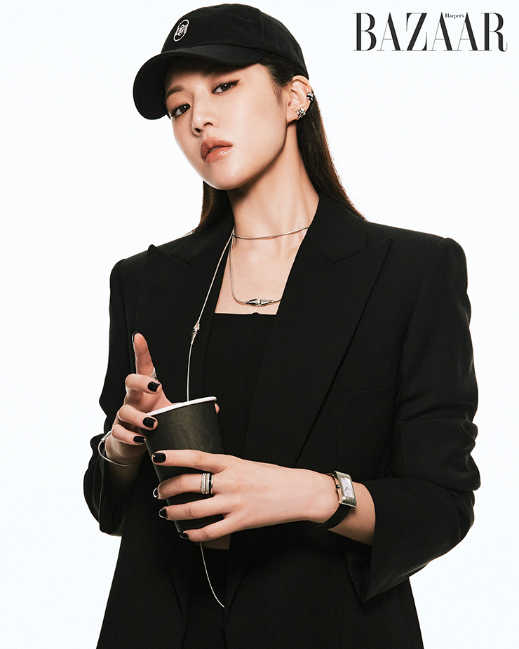 왼쪽 귀 위쪽에 착용한 ‘콰트로’ 블랙 에디션 미디엄 이어 클립, 아래 착용한 ‘콰트로’ 레디언트 에디션 미디엄 이어 클립은 각각 4백만원대, 길게 늘어뜨려 네크리스로 연출한 ‘잭 드 부쉐론’ 잭 화이트 골드 다이아몬드 6-랩은 2천만원대, 함께 연결한 ‘잭 드 부쉐론’ 잭 화이트 골드 트리플 랩은 9백만원대, 그 아래 레이어드한 ‘잭 드 부쉐론’ 잭 화이트 골드 다이아몬드 트리플 랩은 1천만원대, 오른손 검지에 착용한 ‘콰트로’ 레디언트 에디션 다이아몬드 라지 링은 1천만원대, ‘잭 드 부쉐론’ 잭 화이트 골드 다이아몬드 싱글 랩 브레이슬릿은 1천만원대, 왼손 중지에 착용한 ‘콰트로’ 블랙 에디션 다이아몬드 스몰 링은 9백만원대, 레이어드한 ‘콰트로’ 레디언트 에디션 다이아몬드 웨딩 밴드는 8백만원대, 사파이어 카보숑 크라운 장식이 돋보이는 미디엄 사이즈의 ‘리플레’ 워치는 4백만원대 모두 Boucheron.