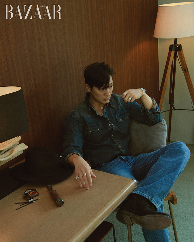 데님 셔츠, 데님 팬츠는 Savage. 부츠는 John Varvatos.