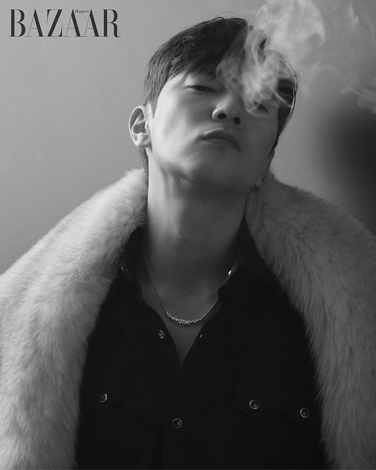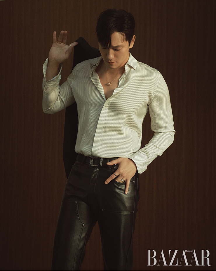 스트라이프 셔츠, 손에 든 재킷은 Saint Laurent by Anthony Vaccarello. 레더 팬츠는 Savage. 벨트는 스타일리스트 소장품.