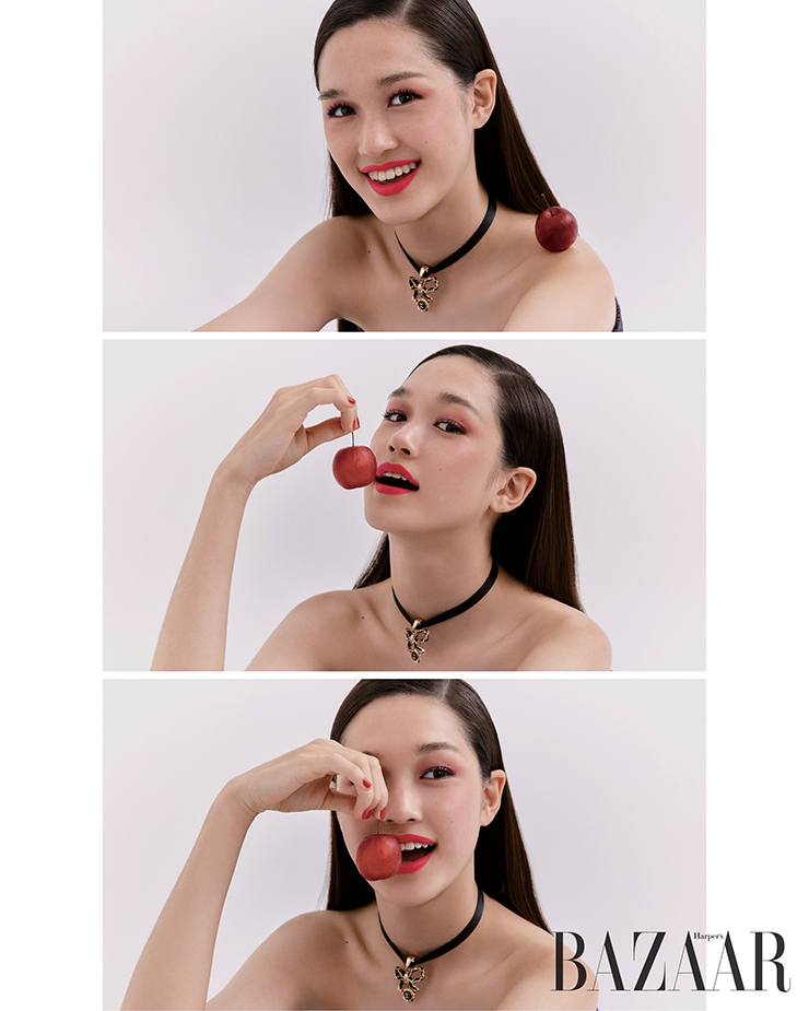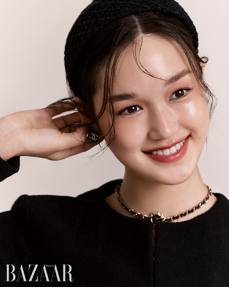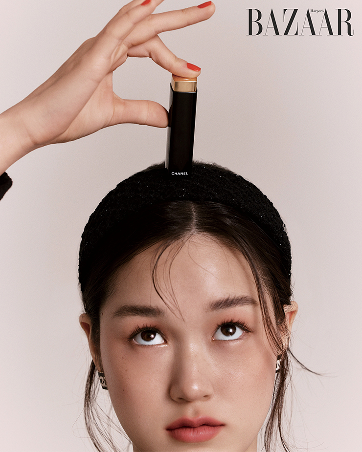 재킷, 헤어밴드, 귀고리, 목걸이는 모두 Chanel.