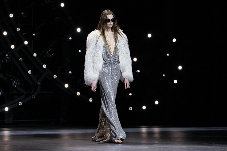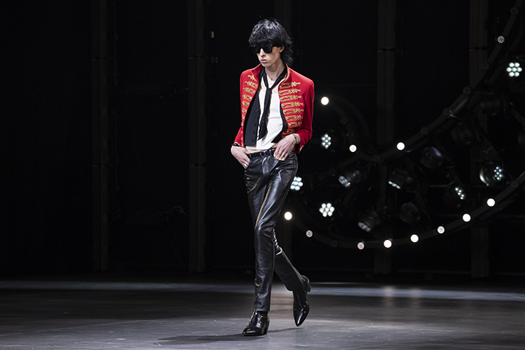 자, 그렇다면 에디 슬리먼식으로 재해석된 인디 슬리즈 스타일은 어떠했을까? 한마디로 정의하자면 ‘록스타의 낮과 밤’ 그 자체. 컬렉션은 남성복, 여성복의 구분 없이 총 87개의 룩으로 구성되었고, 골드 버튼이 장식된 테일러링 피스, 에디 특유의 시가렛 팬츠와 스키니 진, 보헤미안 감성의 액세서리가 한데 어우러져 2000년대 향수를 떠올리게 했다. 피날레에는 금빛 깃털로 장식한 페이크 퍼 재킷, 반짝이는 미니 드레스, 과감한 컷아웃 디테일이 돋보이는 이브닝드레스가 등장했는데 모두 록스타가 밤 문화를 즐길 때 입을 법한 것들이었다. 특히 눈길을 사로잡은 건 인디 슬리즈의 시대정신을 오롯이 담고 있는 남성복 퍼레이드다. 퀸(Queen)의 프레디 머큐리를 오마주한 듯한 골드 트림 장식의 레드 재킷과 가죽 팬츠의 조합, 영국의 인디 록 밴드 악틱 몽키즈나 오아시스를 연상케 하는 화이트 셔츠와 느슨한 타이의 매치, 2000년대를 풍미한 팝 가수 프린스가 즐겨 입던 블랙 파워 수트의 21세기 버전을 만나볼 수 있었다. 아울러 셀린느가 엄격한 모피 금지 정책을 시행하고 있는 만큼 모든 퍼 제품은 시어링 소재로 완성되었고, 쿠튀르 재킷과 드레스는 모두 수작업으로 제작했다고.