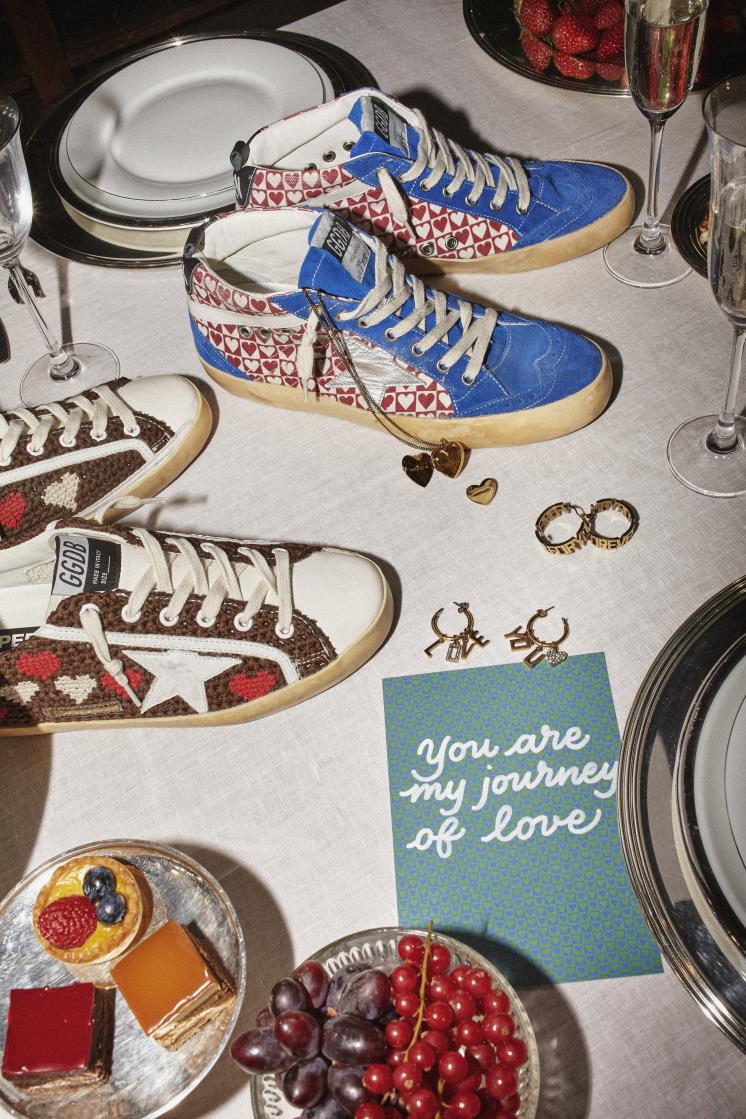 골든구스의 아이코닉 슈즈 슈퍼-스타와 미드스타 스니커즈의 유니크한 변신! 슈퍼 스타는 브라운 컬러의 크로셰 어퍼와 레트, 크림 컬러의 하트 자수가 조화롭게 어우러지고, 메탈리한 가죽 스타 장식을 더해 골든구스만의 빈티지한 무드까지 놓치지 않은 신제품. 미드 스타 스니커즈는 체크 무늬 하트가 가득한 어퍼가 로맨틱함을 더한다. 슈즈와 함께 선보이는 액세서리도 시선강탈인데, 골드 컬러 이어링은 사랑 가득한 레터링으로 장식되어 연인에게 러브 레터를 대신하기에 제격이다.