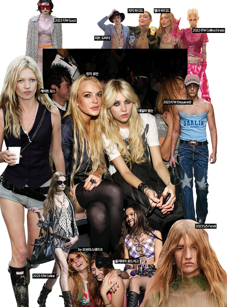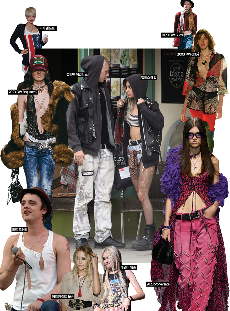 인디 슬리즈란 무엇일까? 2000년대 중반부터 2010년 초반 사이를 대변하는 트렌드로 힙스터 패션, 1980년대의 맥시멀리즘, 1990년대의 그런지 룩이 한데 뒤섞인, 다소 꾀죄죄하고 혼란스러운 스타일을 말한다. 설명이 모호하게 다가온다면, 인디 록 뮤직을 즐기고 퇴폐적인 눈빛을 지닌 그때 그 시절의 ‘나쁜 여자들’을 떠올리면 쉽다. 헤로인 시크라는 새로운 장르를 창조한 케이트 모스를 필두로 스카이 페레이라, 시에나 밀러, 앨리스 데럴, 알렉사 청이 대표적. 당시의 패션 아이콘들은 술과 담배, 음악이 있는 곳이면 어디든 달려갔다. 자연스레 인디 록 밴드, 파티, 페스티벌은 힙스터들이 즐기는 패셔너블한 문화가 되었다. ‘쾌락주의’는 곧 인디 슬리즈를 대표하는 키워드로 떠올랐다. 당시의 무질서한 스타일은 그야말로 혼돈의 도가니다. 보헤미안 무드의 미니 드레스와 벨트, 네온 컬러의 선글라스, 어그 부츠 차림의 시에나 밀러와 아찔한 핫 팬츠에 진흙이 덕지덕지 묻은 부츠를 신은 케이트 모스의 페스티벌 룩, 록스타 티셔츠에 넥타이를 맨 아기네스 딘과 아메리칸 어페럴의 금빛 레깅스를 입은 조 크라비츠의 파티 룩, 옷핀과 밴드로 고정한 러닝셔츠와 주머니에 아무렇게나 찔러 넣은 담배, 해진 컨버스를 신고 무대 위에 올라 온 밴드 리버틴스의 보컬 피트 도허티, 데님 팬츠에 찢어진 망사 스타킹과 가죽 부츠로 데이트에 나선 모델 앨리스 데럴까지. 여기에 빠지지 않는 건 마치 밤새 파티를 전전한 듯한 헤어와 메이크업! 볼까지 번진 블랙 아이라이너와 며칠 동안 물이 닿지 않은 것처럼 보이는 머리카락은 이들의 필수품(?)이라 할 수 있겠다.